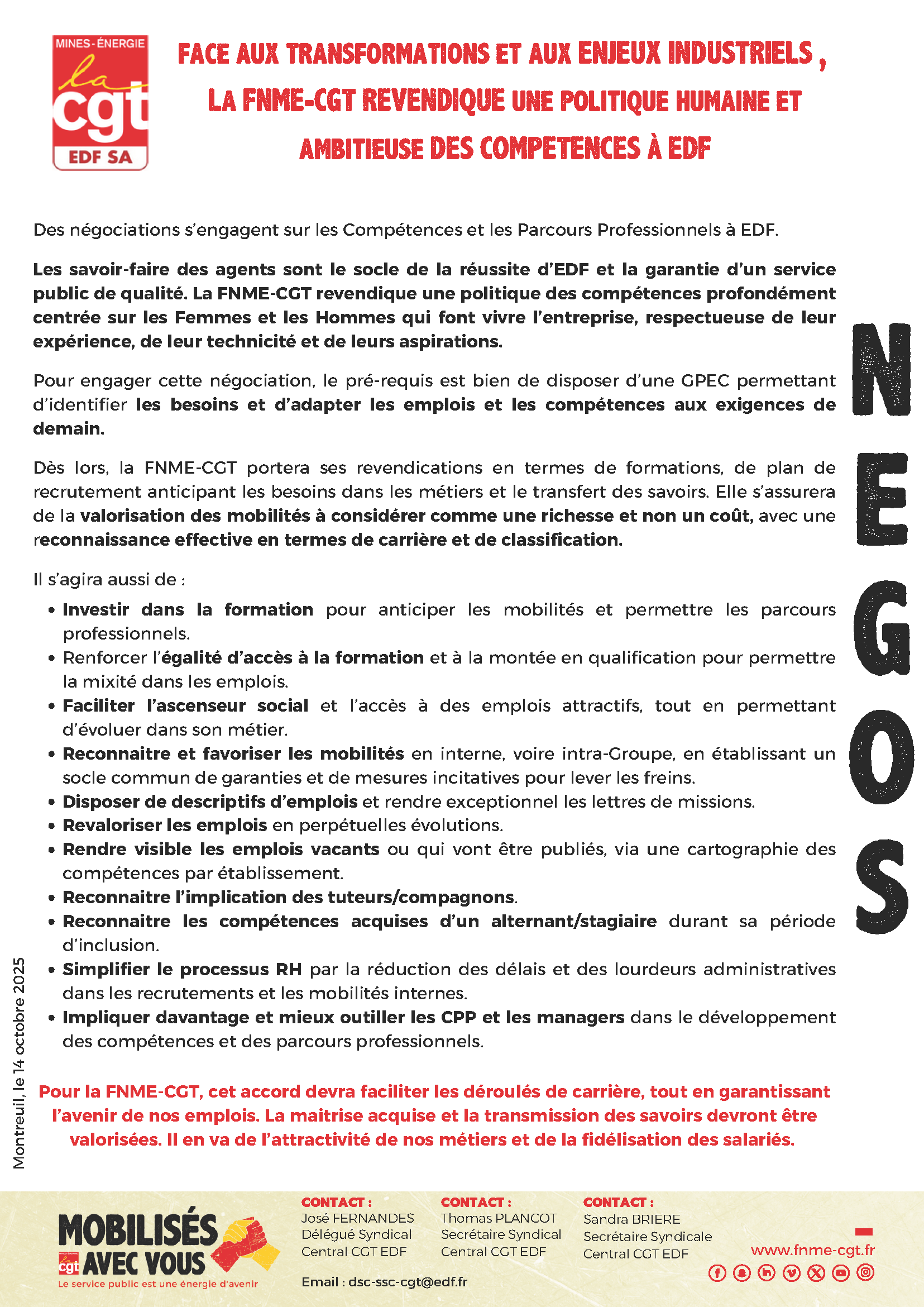 Face aux transformations et aux enjeux industriels , la FNME-CGT revendique une politique humaine et ambitieuse des compétences à EDF SA